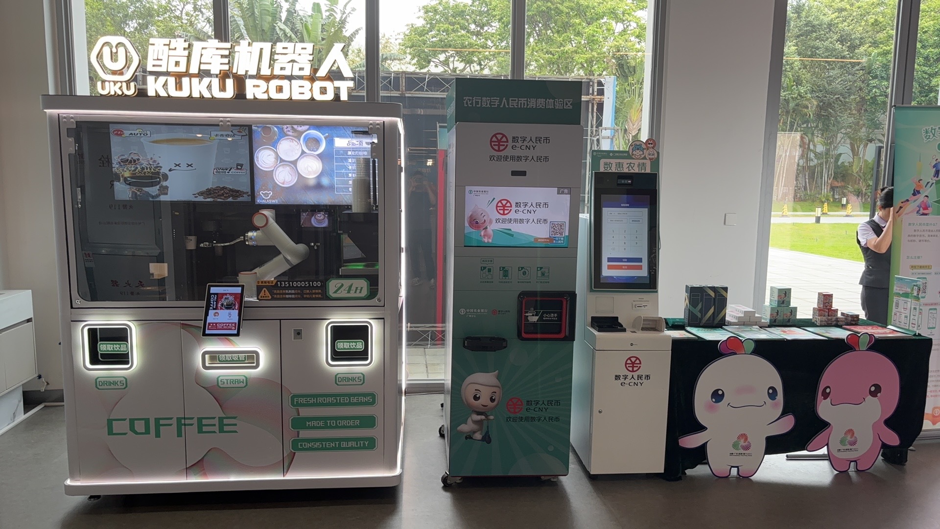 在数字人民币应用展区,体验者在数字人民币准账户自助设备上按提示简单操作,便能即时领取融合岭南文化元素的数字人民币硬钱包。数字人民币硬钱包具备“碰一碰”极速支付功能,无人咖啡机、智能POS机等支付场景均可实现“秒级结算”。此外,集中就餐区支付系统打通数字人民币受理通道,支持硬钱包“即刷即走”,构建起“可感、可用、可互动”的数字人民币体验空间。
